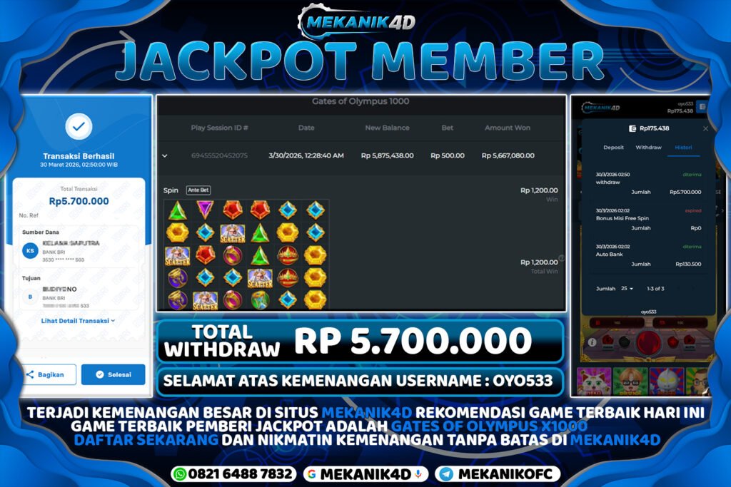 Mau Mendapatkan Kemenangan Nyata Dan Pencairan Cepat? Tentu Saja MEKANIK4D Adalah Pilihan Tepat Untuk Memperoleh Layanan Eksklusif Supaya Lebih Puas Dalam Bermain. Segera Daftarkan Satu Akun Login MEKANIK4D Supaya Bisa Mendapatkan Kemenangan SLOT GATES OF OLYMPUS 1000 Terbesar Sepanjang Berkarir
