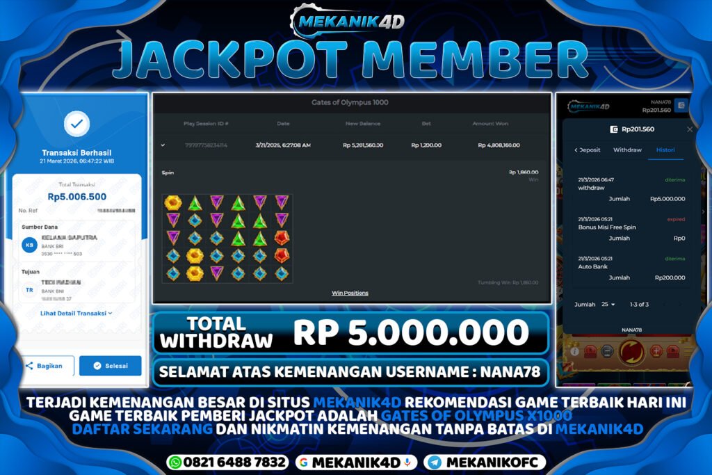 Mau Mendapatkan Kemenangan Nyata Dan Pencairan Cepat? Tentu Saja MEKANIK4D Adalah Pilihan Tepat Untuk Memperoleh Layanan Eksklusif Supaya Lebih Puas Dalam Bermain. Segera Daftarkan Satu Akun Login MEKANIK4D Supaya Bisa Mendapatkan Kemenangan SLOT GATES OF OLYMPUS 1000 Terbesar Sepanjang Berkarir
