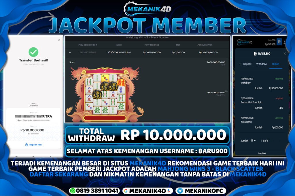 Mau Mendapatkan Kemenangan Nyata Dan Pencairan Cepat? Tentu Saja MEKANIK4D Adalah Pilihan Tepat Untuk Memperoleh Layanan Eksklusif Supaya Lebih Puas Dalam Bermain. Segera Daftarkan Satu Akun Login MEKANIK4D Supaya Bisa Mendapatkan Kemenangan SLOT MAHJONG WINS 3 BLACK SCATTER Terbesar Sepanjang Berkarir